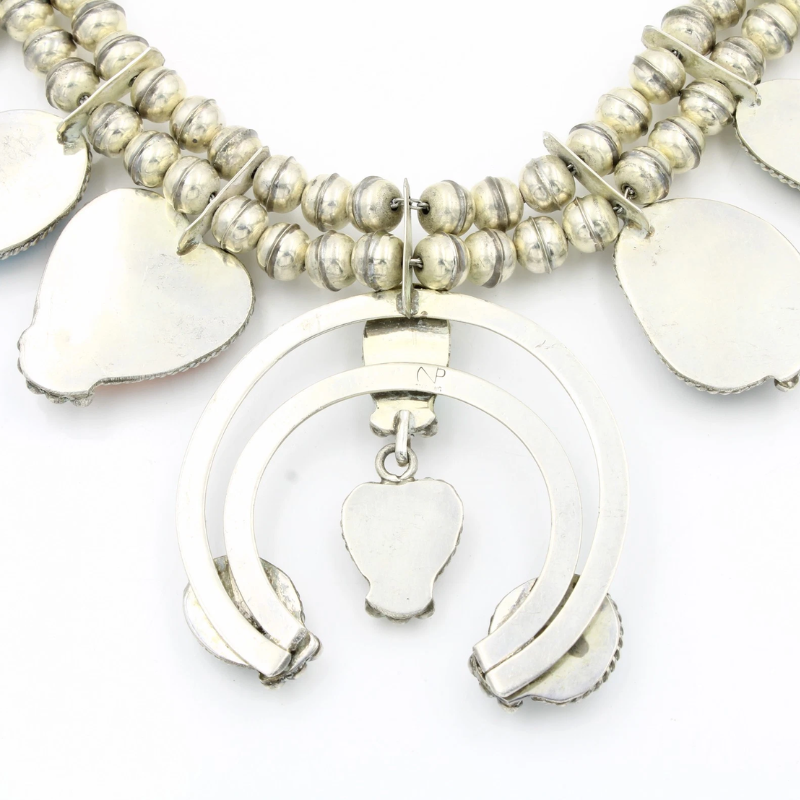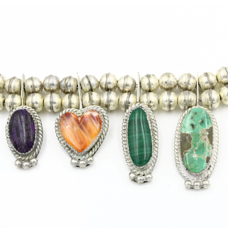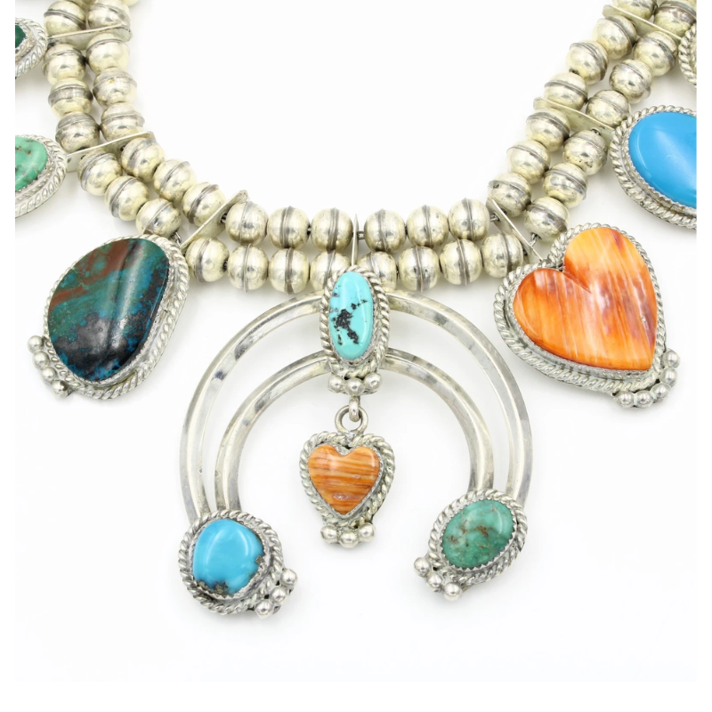 The layered Naja centerpiece is richly detailed and adorned with cabochons of turquoise, purple and orange spiny oyster, malachite, mother of pearl, sugilite, and additional accent stones. Traditional twisted-wire bezels and silver drops add depth and dimension, honoring classic Native jewelry design while showcasing the artist’s individuality.