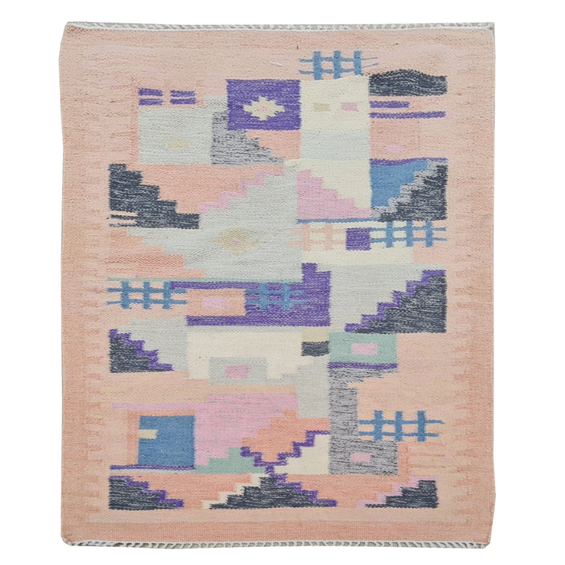 A captivating piece of woven art, this vintage wool kilim blends mid-century charm with timeless craftsmanship. Each geometric form and color transition tells its own story, soft lavender, peach, ivory, and slate hues meeting in an abstract rhythm that feels both soothing and expressive. Handwoven from natural wool fibers, the texture is durable yet inviting, ideal for layering warmth and artistry into any room.